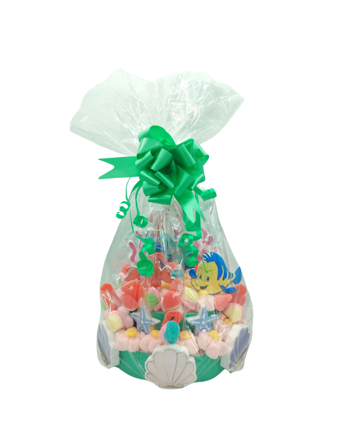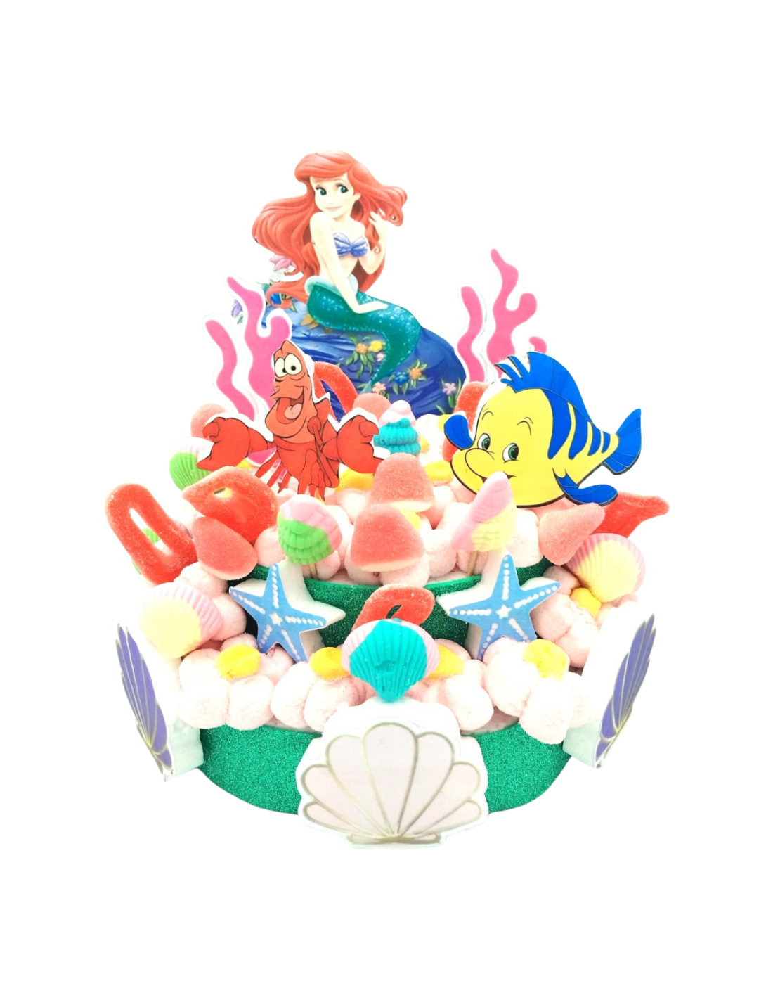 Sumérgete en el fantástico mundo de LA SIRENITA con esta tarta de gominolas y nubes tienes la opción de tematizarla de tu princesa favorita.